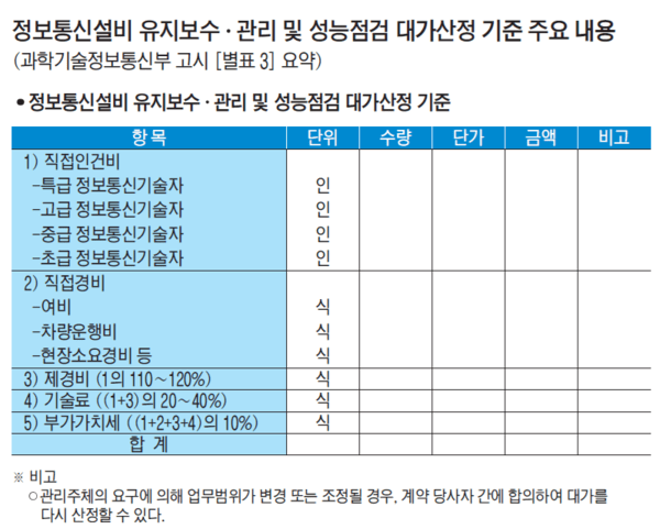 과학기술정보통신부 고시인 ‘정보통신설비 유지보수·관리기준’에 따르면 정보통신설비의 소유자 또는 관리자(관리주체)가 유지보수·관리 업무를 정보통신공사업자에게 위탁하는 경우 그 대가는 해당 고시 ‘별표 3’의 정보통신설비 유지보수·관리 및 성능점검 대가산정 기준에 따라 산정할 수 있다. 또한 관리주체가 성능점검을 정보통신공사업자 또는 용역업자가 대행하게 하는 경우에도 그 대가를 ‘별표 3’ 기준에 따라 산정할 수 있다.