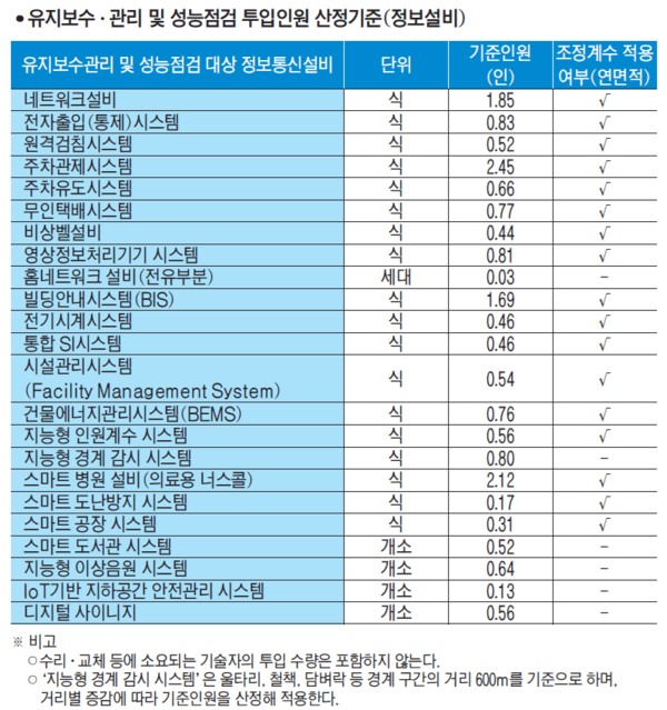 여기서 기준인원은 기술자 한 명이 유지보수·관리 또는 성능점검을 1회 실시하는데 투입되는 수량을 말한다. 엔지니어링 기술자의 등급별 노임단가는 △특급기술자 33만713원 △고급기술자 30만1470원 △중급기술자 27만2298원 △초급기술자 23만4973원이다.